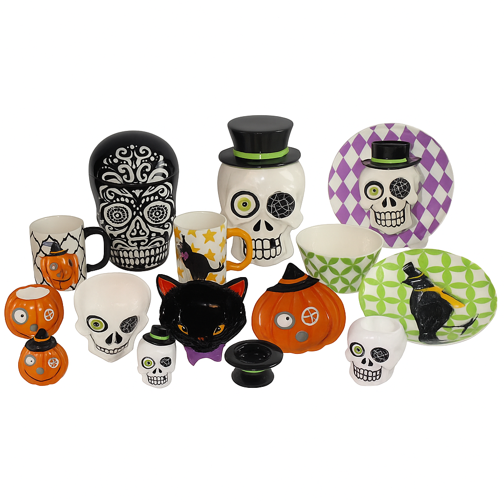 This vibrant ceramic set captures the playful and spooky spirit of Halloween with skulls, pumpkins, and black cats.